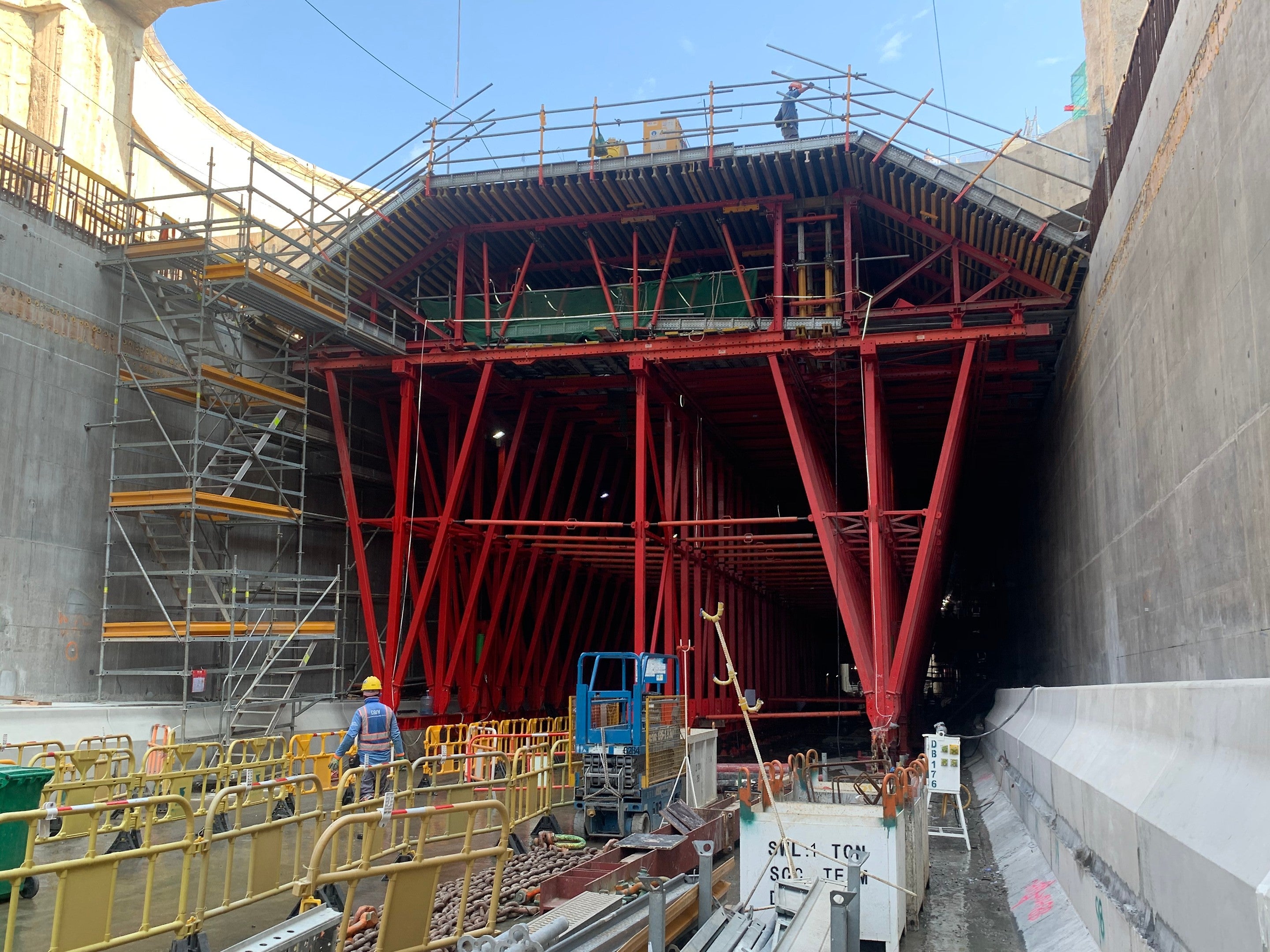 PERI 與 DBJV 密切合作,在這兩個登陸點上建造各種結構。在北面,TRIO 面板系統用於通風井和通風大樓。在南面,有各種系統來實現施工效率和安全性。定制棚架吊車、牆壁和樓板吊車用於建造 250m 長的明挖隧道。